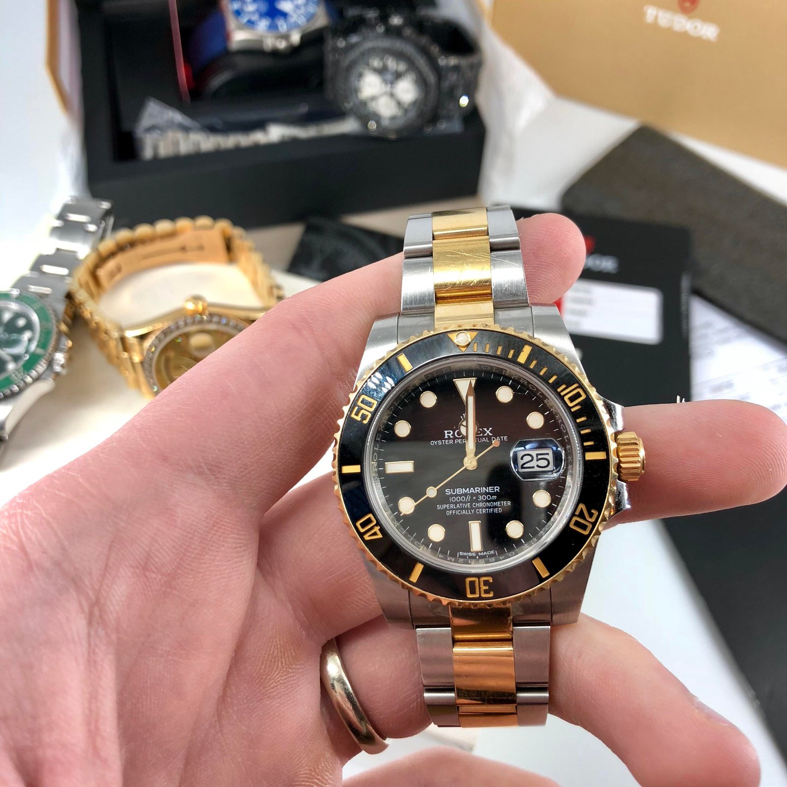 The Rolex Submariner might be the most recognizable watch in the world, and when crafted in two-tone steel and yellow gold like this ref. 116613, the Submariner becomes even more so an icon of serious luxury. We love the six-digit Submariners from this era for the refined case and bracelets, the ceramic bezel insert, the svelte 13mm thickness, and the venerable 3135 automatic winding movement with date and 48-hour power reserve.