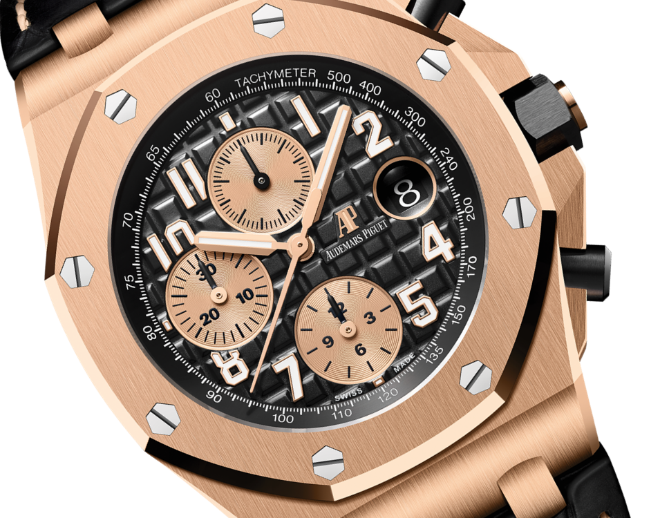 Black dial engraved with “Méga Tapisserie” oversized check decoration, with rose gold sub-dials, rose gold applied hour-markers and Royal Oak hands with luminescent coating, black inner bezel.