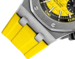 Yellow dial with “Méga Tapisserie” pattern, black counters, blackened gold applied hour-markers and Royal Oak hands with luminescent coating, black rotating inner bezel with diving scale and zone from 60 to 15 minutes in yellow.