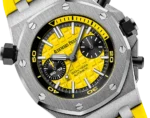 A summery bright yellow Oak Offshore. Blatant, refreshing, funky. Featuring the selfwinding Manufacture caliber 3124/3841 with a power reserve of 50 hours, 59 jewels and 21,600 vibrations/hour fitted into a 42 mm stainless steel case with sapphire crystal open caseback.