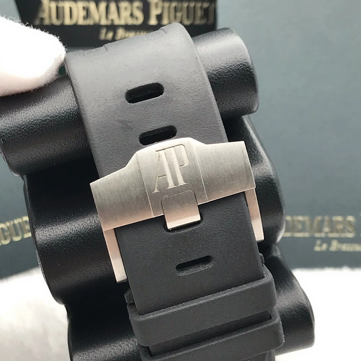 Black dial with “Méga Tapisserie” pattern, white gold applied hour-markers and Royal Oak hands with luminescent coating (black minutes hand), black or silver-toned rotating inner bezel with diving scale and zone from 60 to 15 minutes in black.