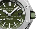 Khaki dial with “Méga Tapisserie” pattern, white gold applied hour-markers and Royal Oak hands with luminescent coating, khaki rotating inner bezel with zone from 60 to 15 minutes in white.