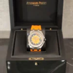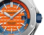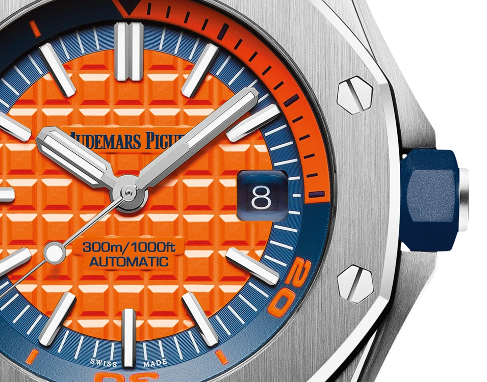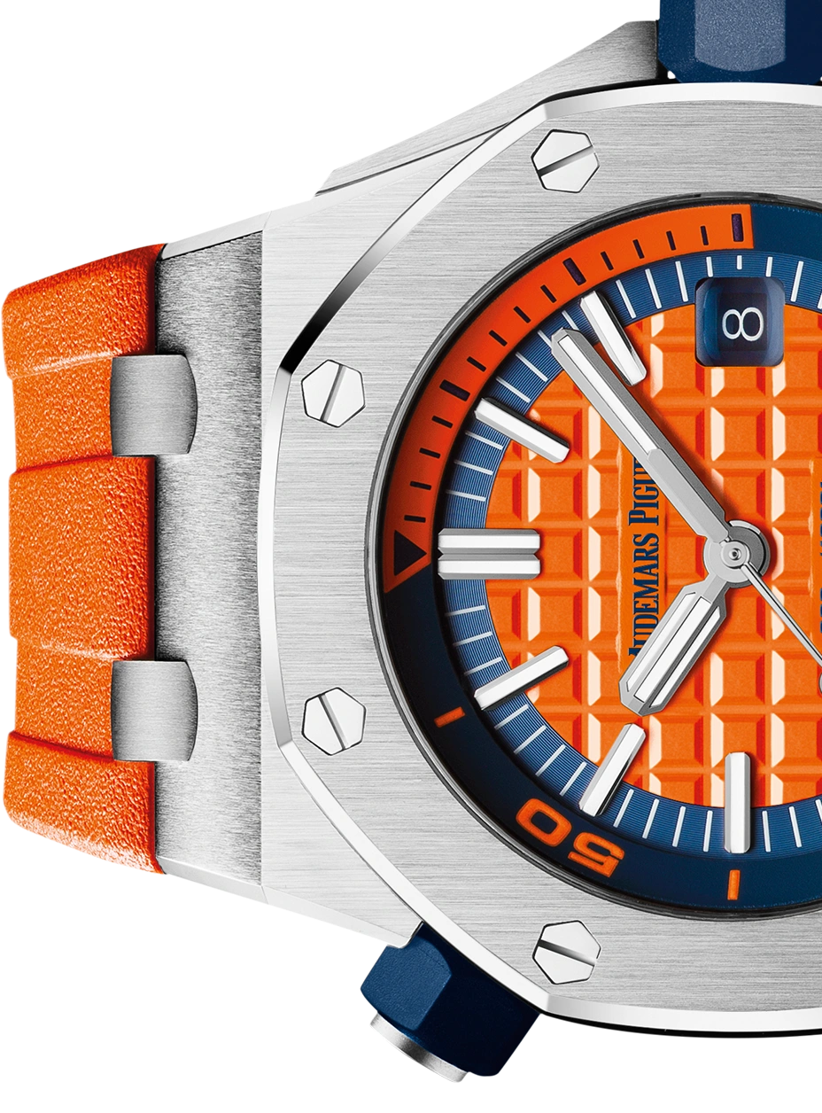 Orange dial with “Méga Tapisserie” pattern, white gold applied hour-markers and Royal Oak hands with luminescent coating, blue rotating inner bezel with diving scale and zone from 60 to 15 minutes in orange