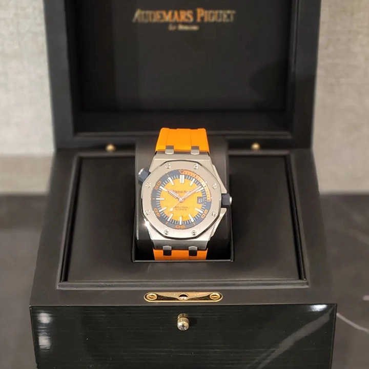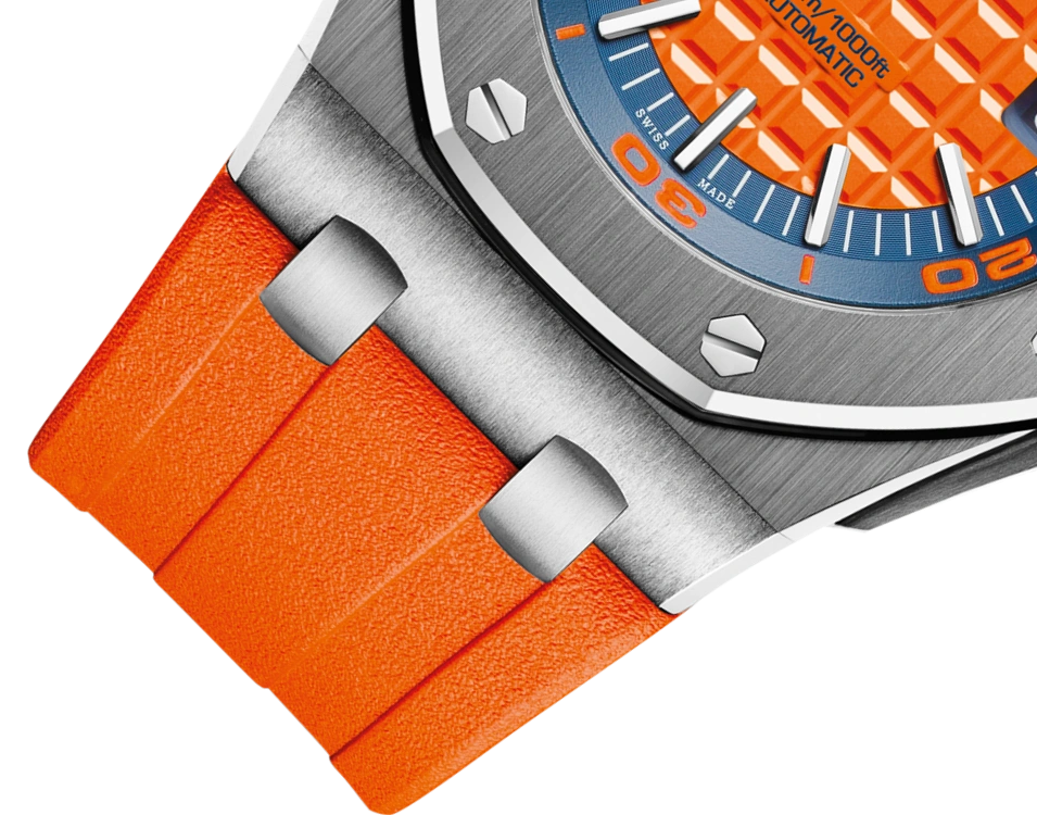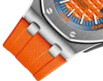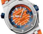 Bright tangerine orange dial with “Méga Tapisserie” decoration, white gold applied hour-markers and Royal Oak hands. A rugged timepiece with serious diving attributes and a very fresh and fun appeal.