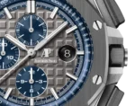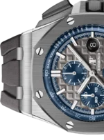 Grey dial with “Mega Tapisserie” pattern, blue counters and blue external zone, white gold applied hour-markers and Royal Oak hands with luminescent coating, blue inner bezel.
