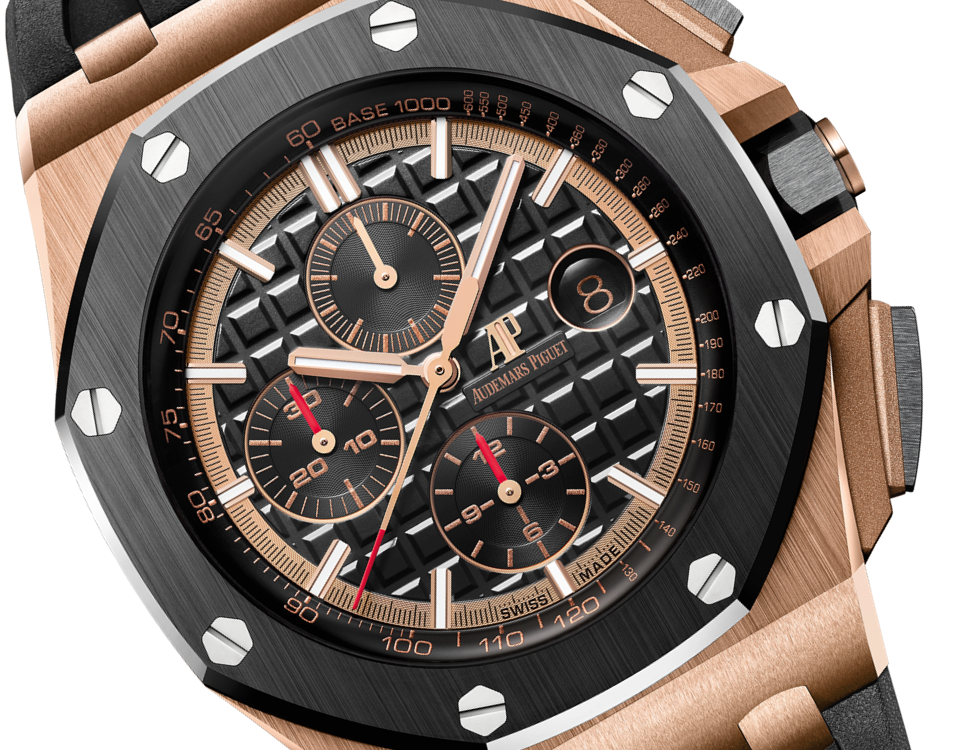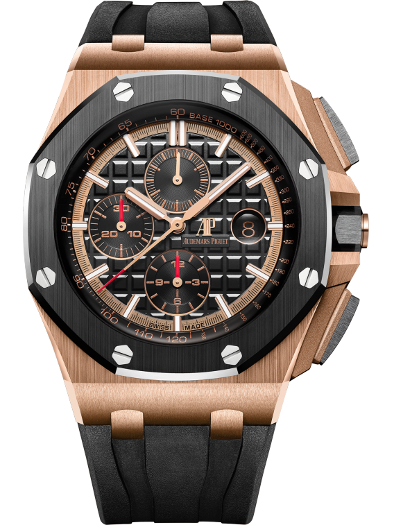 18-carat pink gold case, glareproofed sapphire crystal and caseback, black ceramic bezel, pushpieces and screw-locked crown, pink gold pushpiece guards.