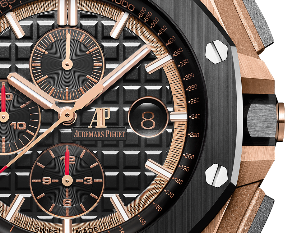 Black dial with “Méga Tapisserie” pattern, black counters, pink gold applied hour-markers and Royal Oak hands with luminescent coating, black inner bezel.