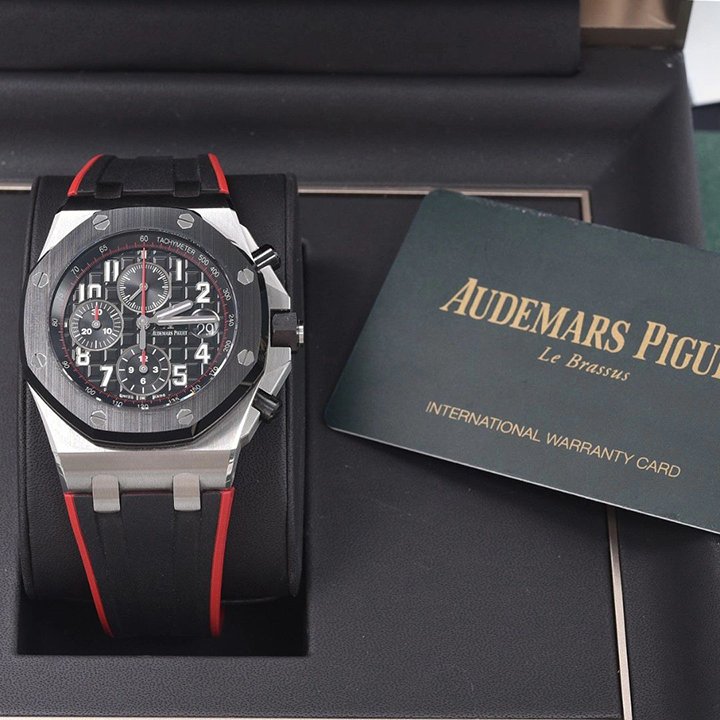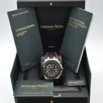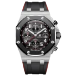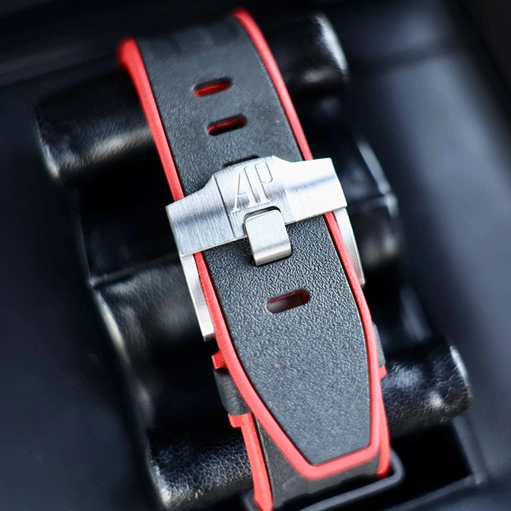 A watch made for adventure. Black with a hint of red to accentuate the chronograph functions and strap. It features a typical combination of stainless steel, ceramic and rubber, typical of the Royal Oak Offshore.