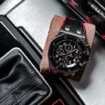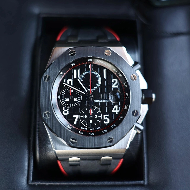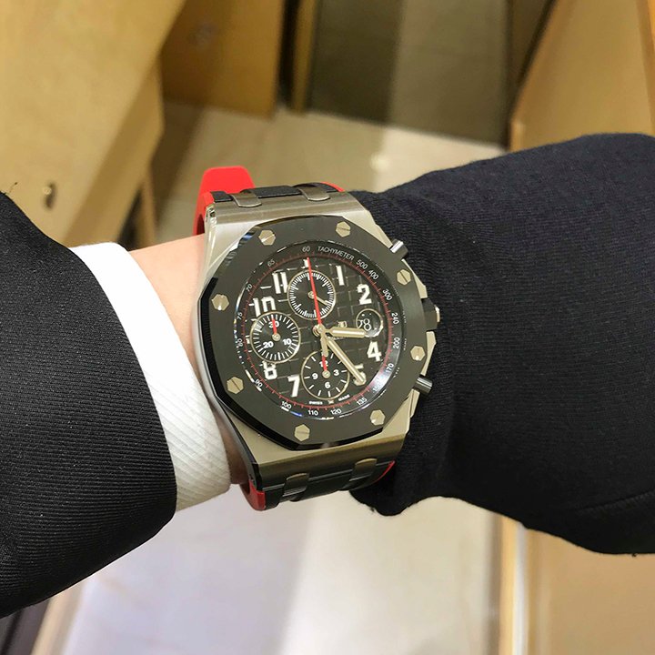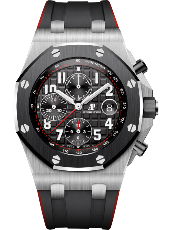 A watch made for adventure. Black with a hint of red to accentuate the chronograph functions and strap. It features a typical combination of stainless steel, ceramic and rubber, typical of the Royal Oak Offshore.