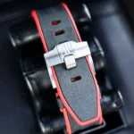 Two-tone black and red rubber strap with stainless steel pin buckle.