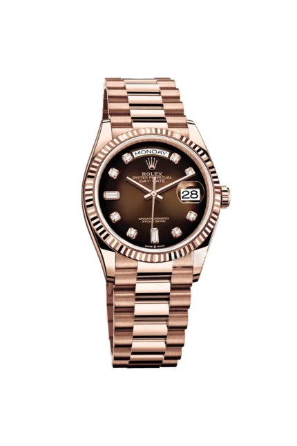 <!– –> The Oyster Perpetual Day-Date 36 watch in 18 ct Everose gold, with a diamond-set rhodium white dial, a