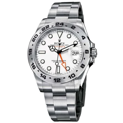 This Oyster Perpetual Explorer II in Oystersteel with an Oyster bracelet features a white dial with an arrow-shaped 24-hour hand